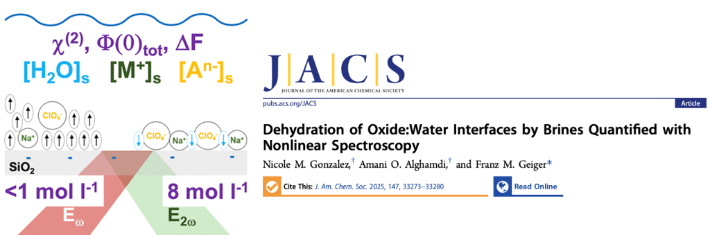 Now, our new research shows that this situation is different at interfaces. In a study we published in the Journal of the American Chemical Society, we directly measure the coverage of water and ions on silica:water interface under extreme salt concentrations, conditions where most experimental tools lack sensitivity. What we find overturns assumptions: instead of ions endlessly crowding the surface as more salt is added, the system reaches a surprising balance (half a monolayer of ions and half a monolayer of water molecules), the latter having flipped their orientation from “protons to the surface” to “oxygens to the surface” at the highest concentration. This work shows that when you keep adding salt to water, at some point you don’t add the charged ions like Na+ and Cl anymore but rather ion pairs such as [Na+…Cl], where the net charge is zero.