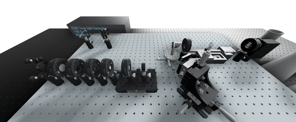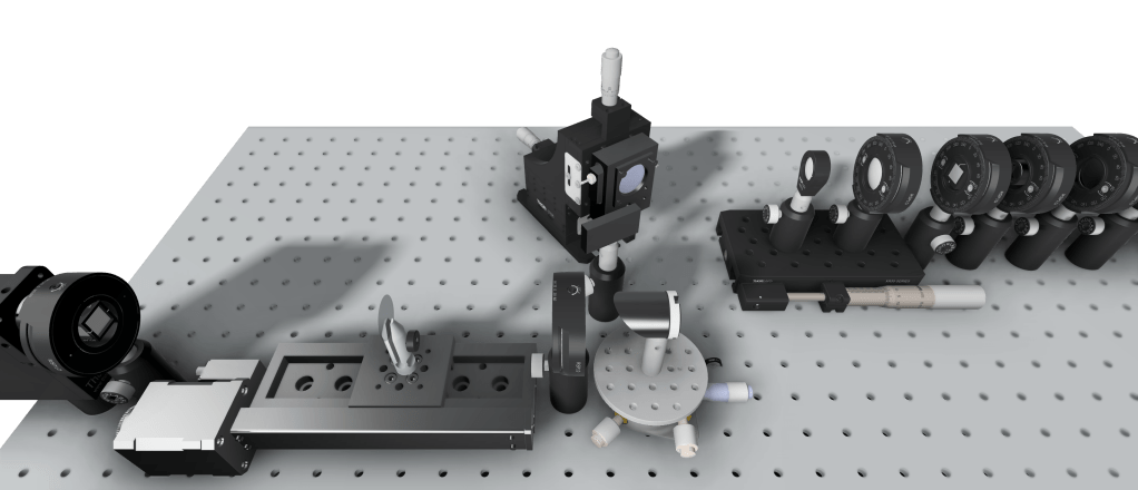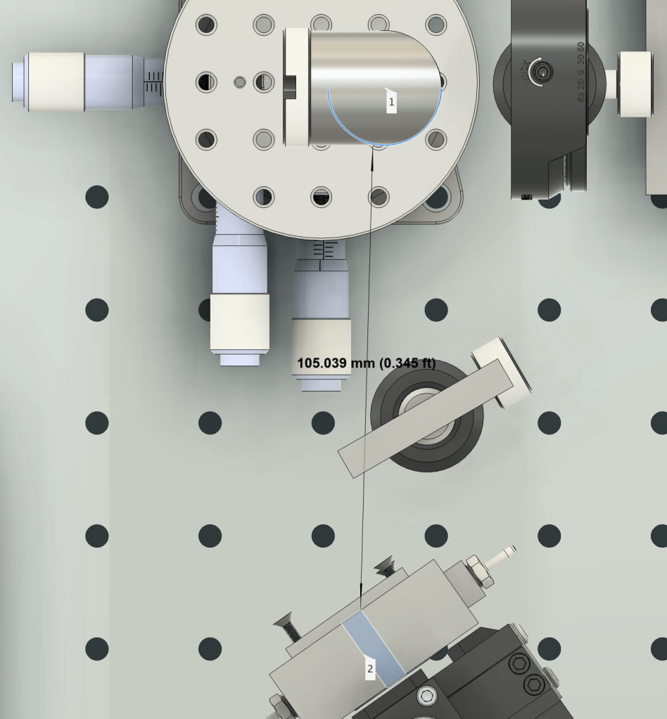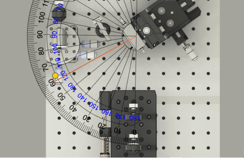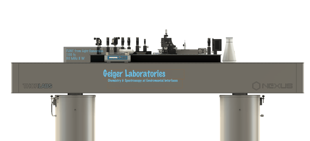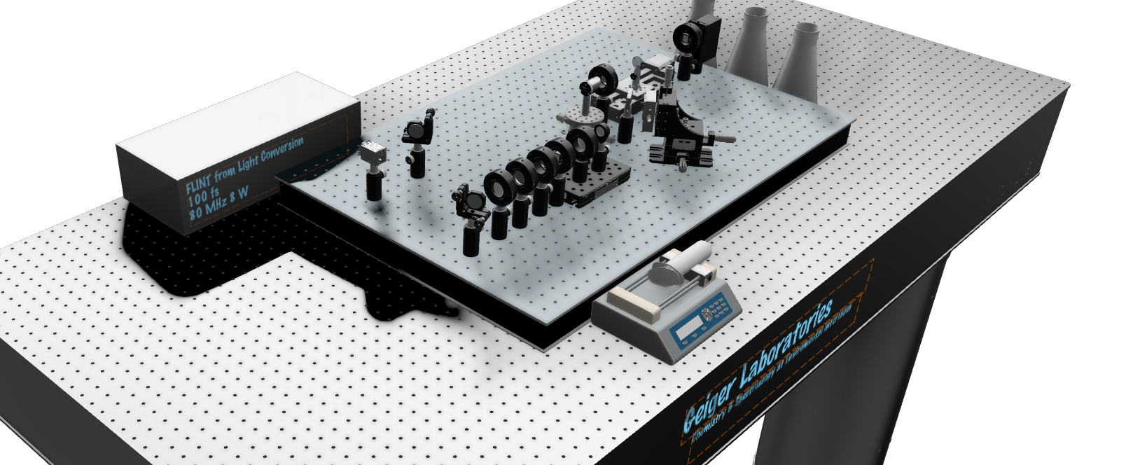 Figure 1. High-resolution 3D model of our heterodyne-detected second harmonic generation (HD-SHG) spectrometer. All distances, angles, and dimensions in this CAD model are true to the actual experimental setup. Each optical component accurately represents the real elements used in our instrument, as described and validated in our publication: